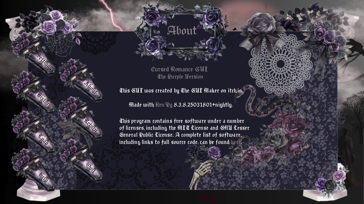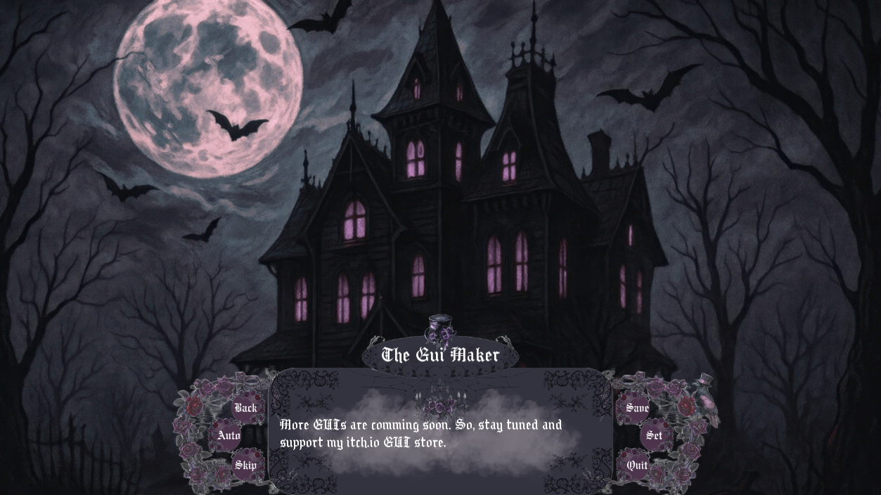 | Tags | Asset Pack, customized-gui, dark-romance, Gothic, Graphical User Interface (GUI), Horror, Ren'Py, renpy-asset, renpy-gui, visual-novel-gui |